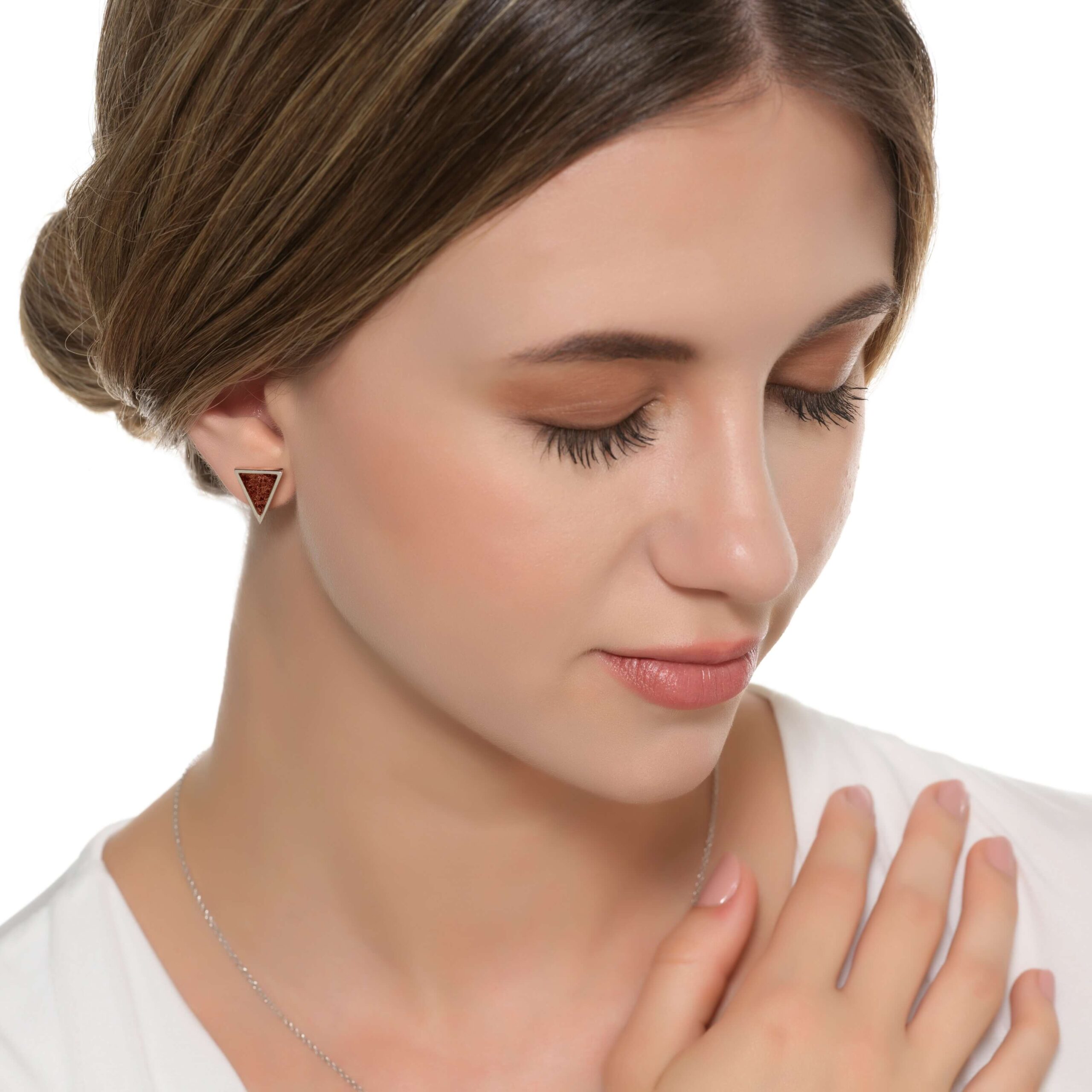 Exact description: Small triangle earrings with white gold socket and red wine stone