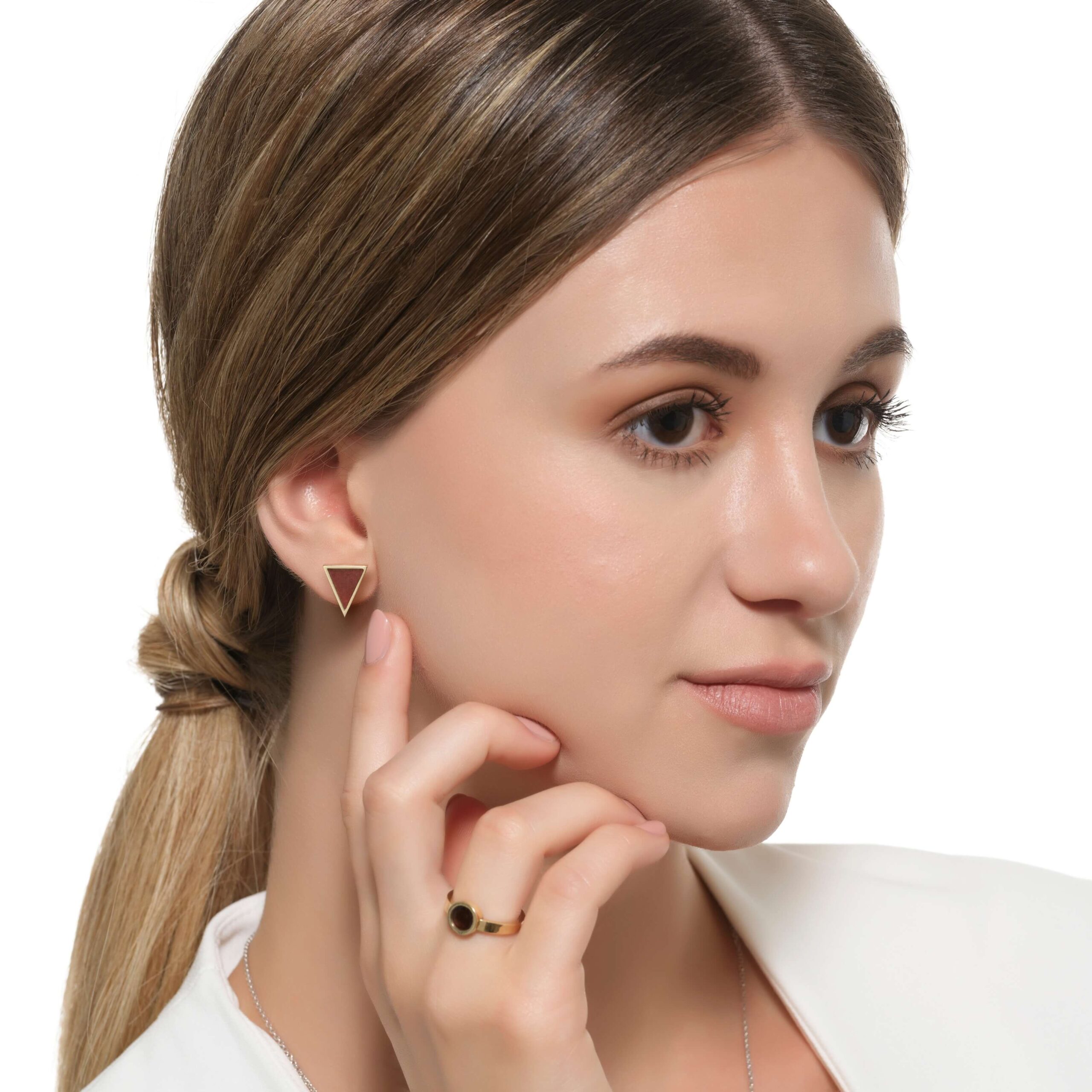 Exact description: Small triangle earrings with yellow gold socket and red wine stone