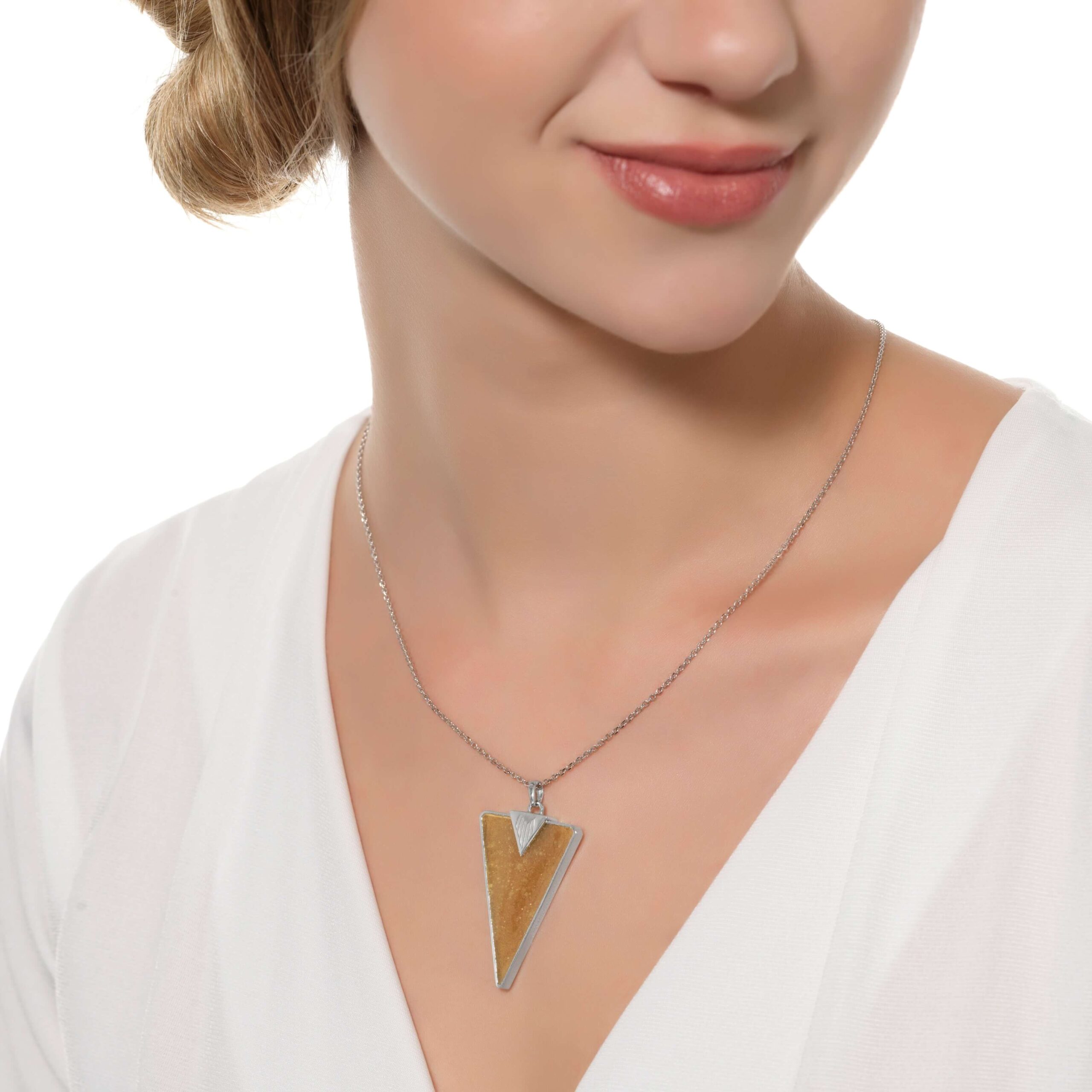 Exact description: White gold large triangle pendant with white wine stone